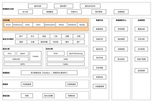 数据服务/应用层:该层通过提供BI分析产品、数据服务接口、营销、报表类产品,向内部运营人员、外部客户、合作伙伴提供数据分析决策能力。